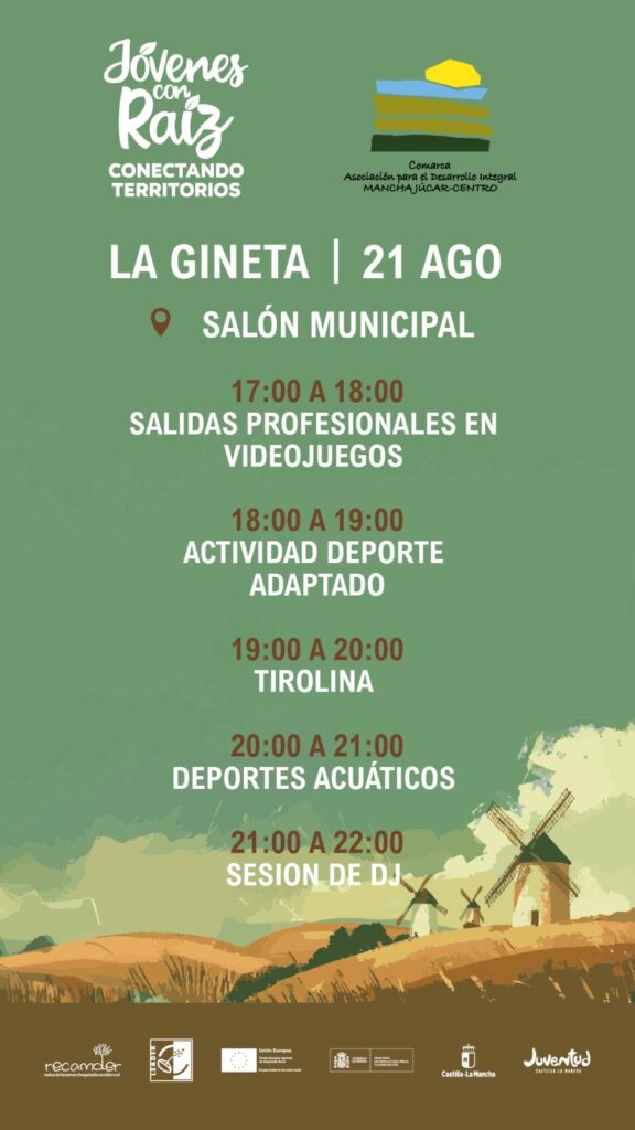 El evento de La Gineta, que será de índole comarcal, se celebrará el jueves 21 de agosto, a partir de las 17,00 horas en el Salón Municipal. La jornada comenzará con una sesión sobre las opciones laborales que existen en el mundo de los videojuegos además de realizar una actividad práctica con consolas PS5. Tras ello, tendrá lugar una actividad deportiva adaptada, a cargo del deportista profesional Aladino Pandiella, donde los participantes se pondrán en la piel de personas con discapacidad física y vivirán sus retos de primera mano probando distintos deportes adaptados como el baloncesto en silla de ruedas, la boccia, el tiro con arco o el handbike.