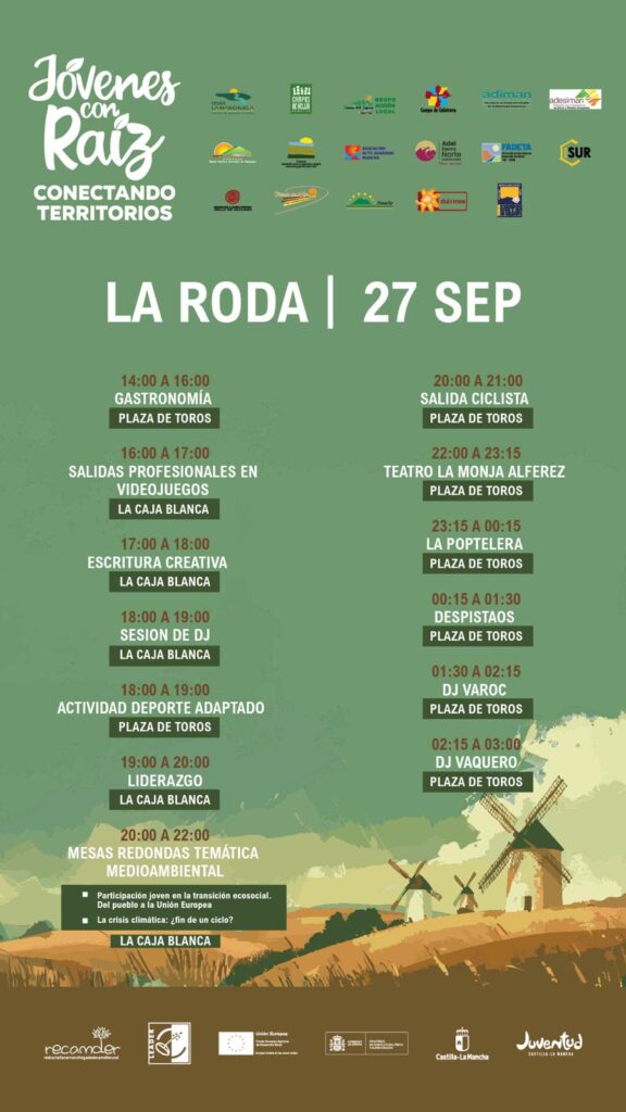 En cuanto al evento de La Roda, tendrá carácter regional, y se celebrará el 27 de septiembre. Incluirá un total de 13 actividades desde las dos de la tarde hasta las tres de la madrugada, que incluirán música, teatro, escritura creativa, gastronomía, deporte adaptado, salida ciclista, y conferencias de temática medio ambiental o sobre liderazgo, entre otras muchas.